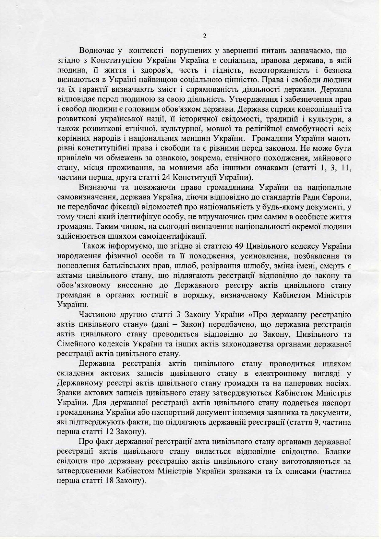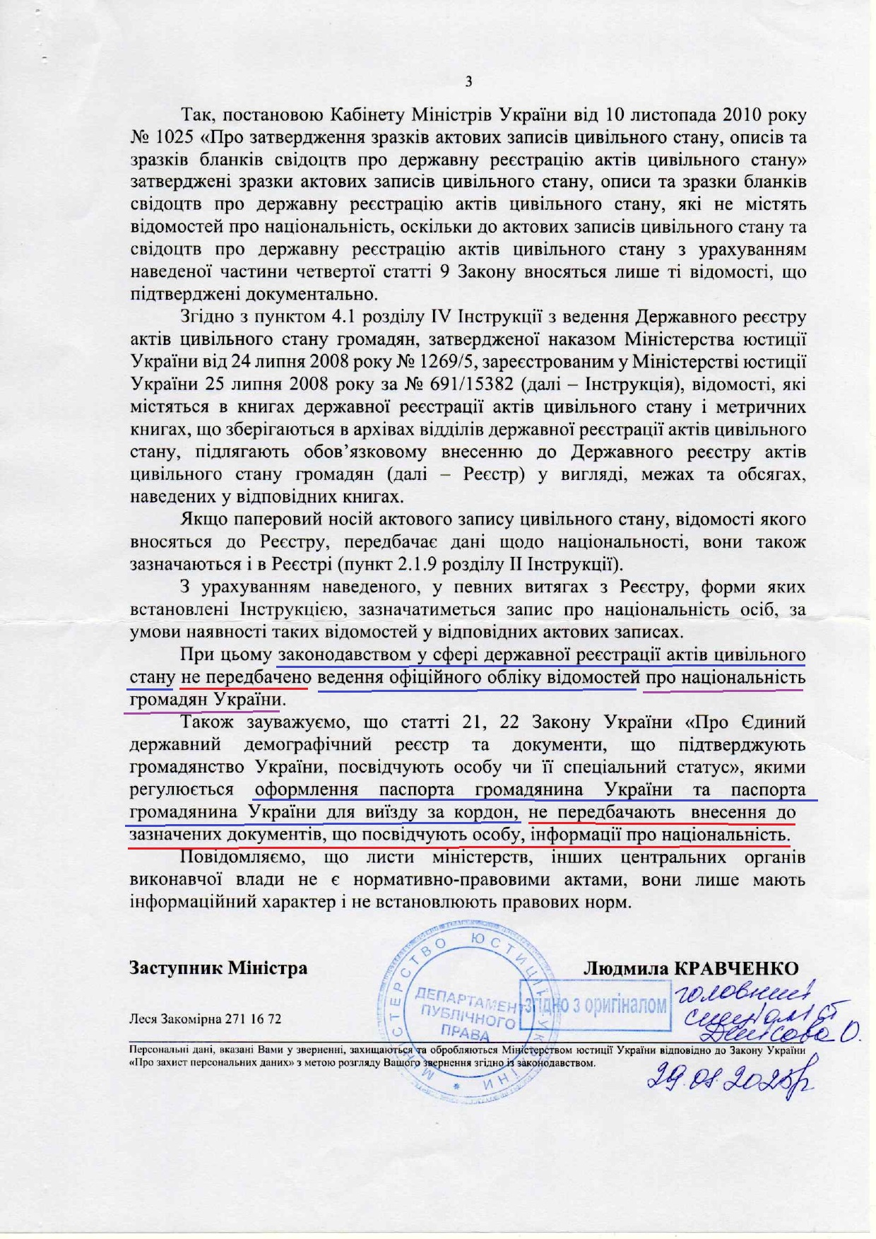 The response of the Ministry of Justice of Ukraine fully reproduces the official position of the State Migration Service, confirming that Ukrainian legislation does not provide for the legal recording of a citizen’s nationality in any documents, including passports, birth certificates, and civil status records.